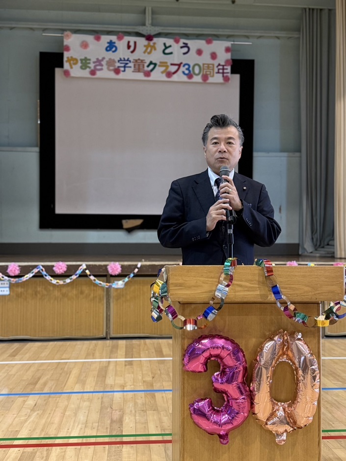 朝は地元のやまざき学童クラブの30周年記念式典に出席…