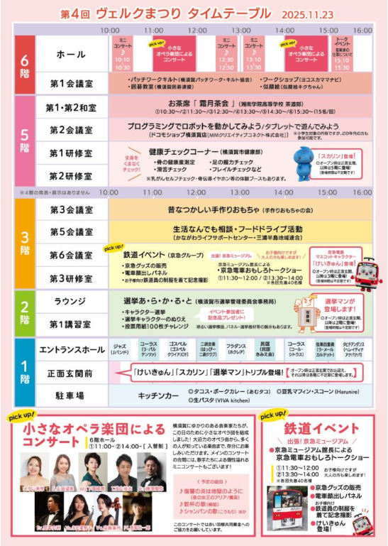 オペラ楽団のコンサート、鉄道イベントや文化振興イベント、横須賀市健康部による健康チェックコーナーなど、大人から子どもまで楽しめるイベントが盛りだくさん。