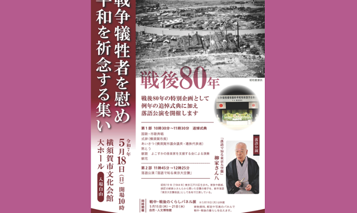 戦争の犠牲となられた方々を慰め、恒久平和を祈るため、横須賀市では毎年5月に横須賀市戦争犠牲者を慰め平和を祈念する集いを開催しています。