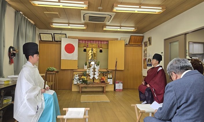 当初は台風の良そうでしたが、早めにそれてくれたため台風一過の晴天に恵まれましたが、朝方まで降っていた雨で、神社境内がぬかるんでいることなどを鑑み、きょうは吉井町内会館の2階にある安房口神社社務所内で執り行いました。