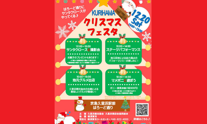 12月20日(土)10時から15時まで(雨天時、翌21日に順延)に久里浜商店街はろーど通りにおいて2025 久里浜クリスマスフェスタが開催されます。