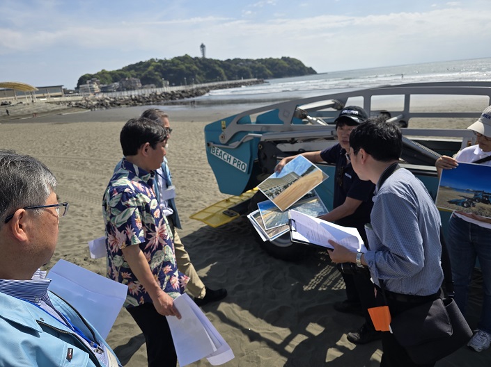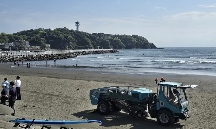 きょうは神奈川県海水浴場連合会の顧問として、自走式ビーチクリーナー「BEACH PRO」のデモンストレーションの視察に片瀬西浜海岸へ行ってきました。