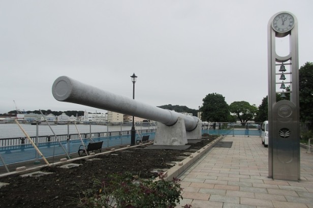 きょうはあいにくの天気のため目立ちませんが、JR横須賀駅を降りて海側を眺めると、一段と目を引く物体が陸奥の主砲…