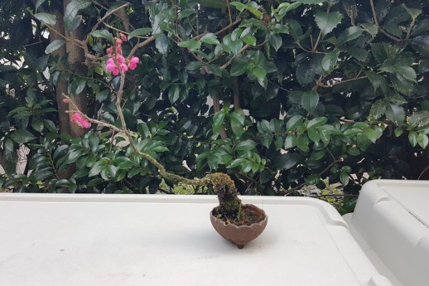 そんな寒い日ではありますが、庭の長寿梅の盆栽が花を咲かせました。