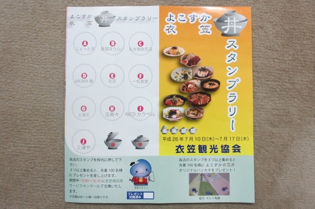 なお、スタンプラリーのパンフレットはJR衣笠駅、京急主要駅の横須賀市専用ラック、京急バス衣笠営業所、衣笠行政センター、池上市民プラザ、はまゆう会館、横須賀市役所商業観光課、衣笠商店街広報ラック、衣笠商店街サービスセンター、よこすか衣笠丼参加各店、YYポート横須賀などでもらえます。
