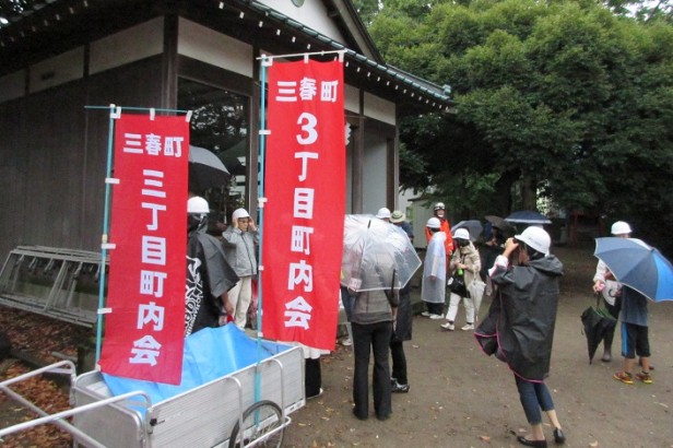 毎年、一時避難地である神社に集合し、その後広域避難地である中学校まで歩くのですが、雨の中多くの参加者がありました。