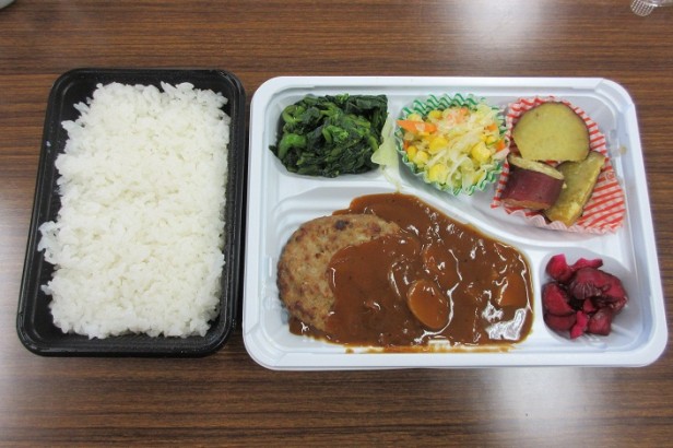 きょうのメニューは、ごはん並盛、ハンバーグデミグラスソース、サツマイモの甘煮、コールスローサラダ、おひたし、漬物です。