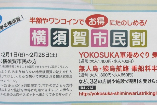 すでにフェイスブックなどでは話題沸騰中ですが、2月1日(日)から2月28日(土)までの1カ月、横須賀市民割2015が開催されます。
