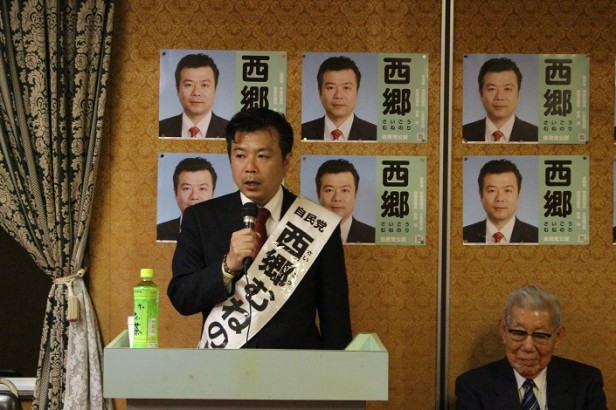 後援会長のあいさつに続き、先日の県議会議員選挙でトップ当選を果たした牧島功県議会議員の応援演説…