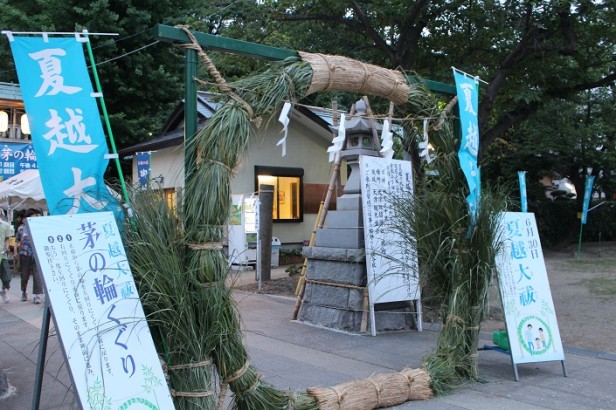 お祓いの後、神社の境内に建てられた茅を巻いた大きな輪をくぐって無病息災を願います。