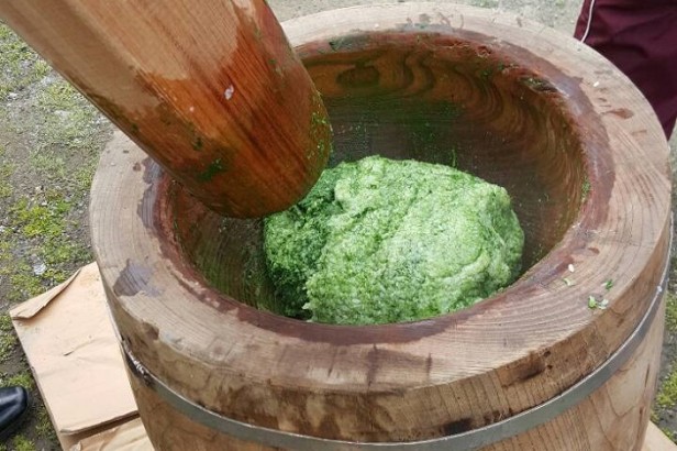 まずはもち米をつぶしながらヨモギを混ぜていくのですが、これが意外と一苦労です。