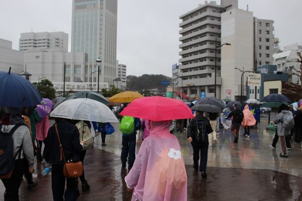 スタート直後は皆さん傘などを持ち、足場を確認しながら歩くためペースは遅めでしたが、横断歩道を超えると皆さん徐々にペースが上がり、私は後方…